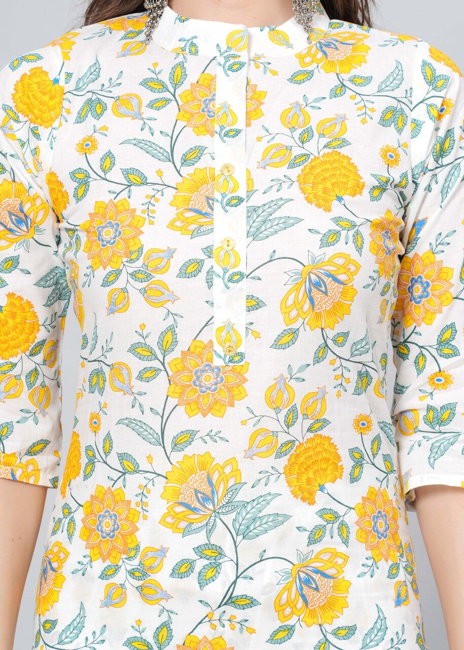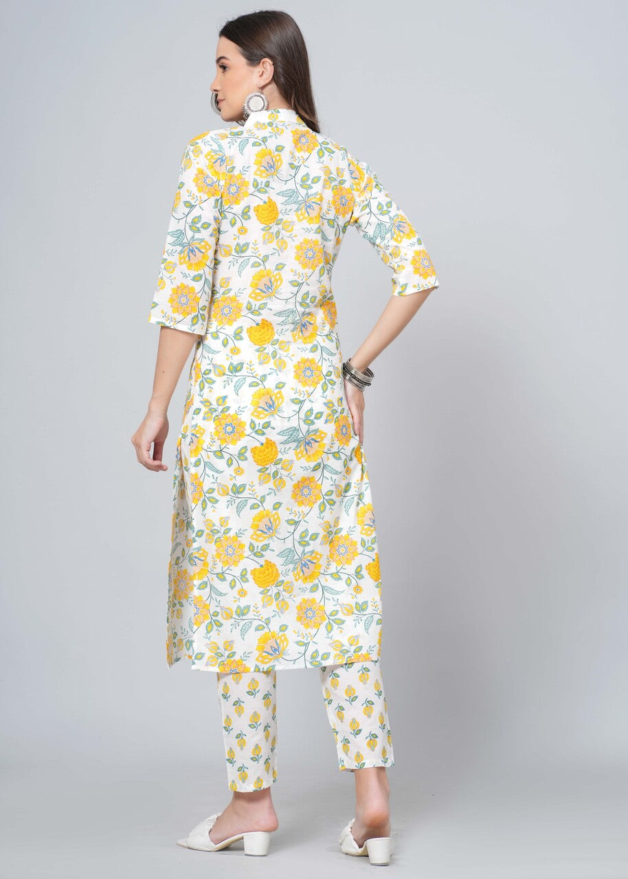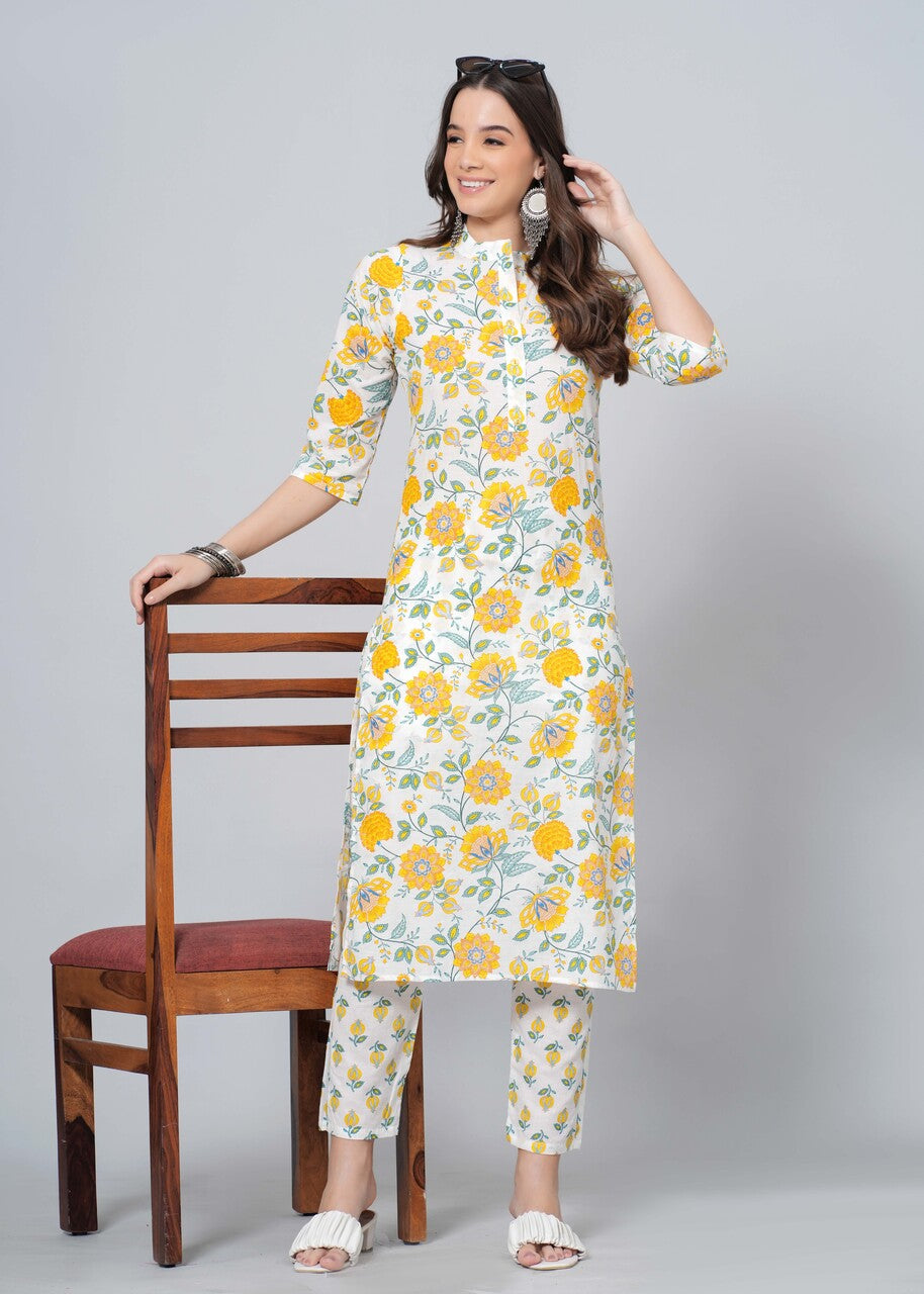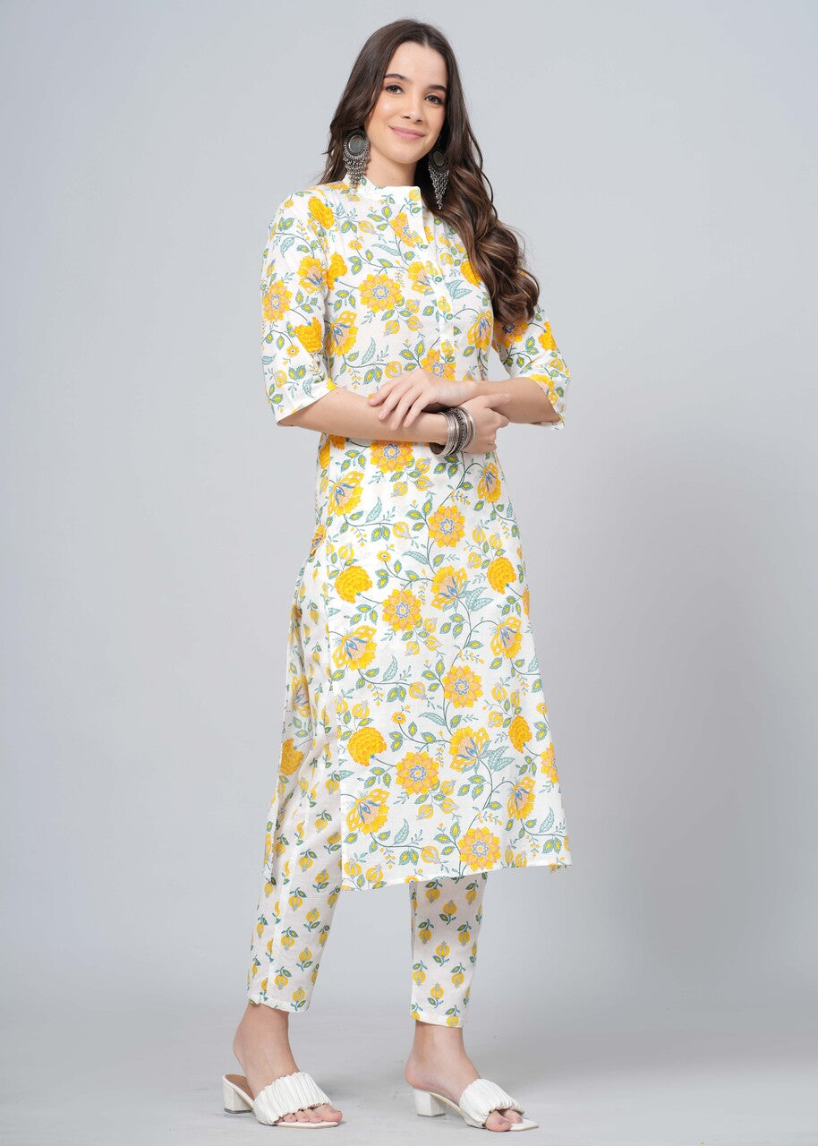 This beautiful straight-cut kurta set features a vibrant yellow floral print on a crisp white base. The kurta has a button-down neckline with 3/4 sleeves, offering a perfect balance of traditional elegance and modern style. The outfit is paired with matching floral-printed pants, ensuring a coordinated look. Ideal for casual outings or festive occasions, this set is both comfortable and stylish.