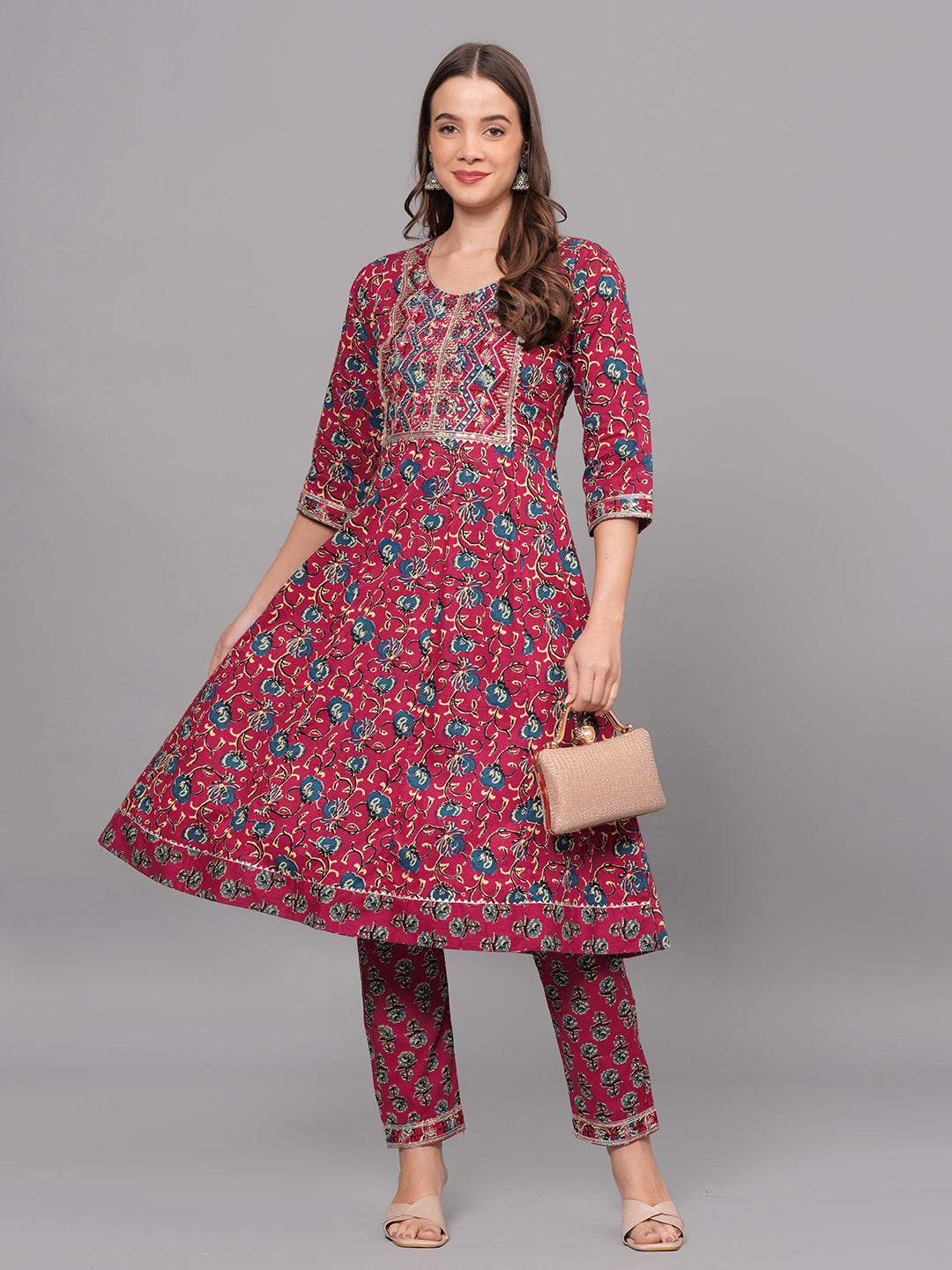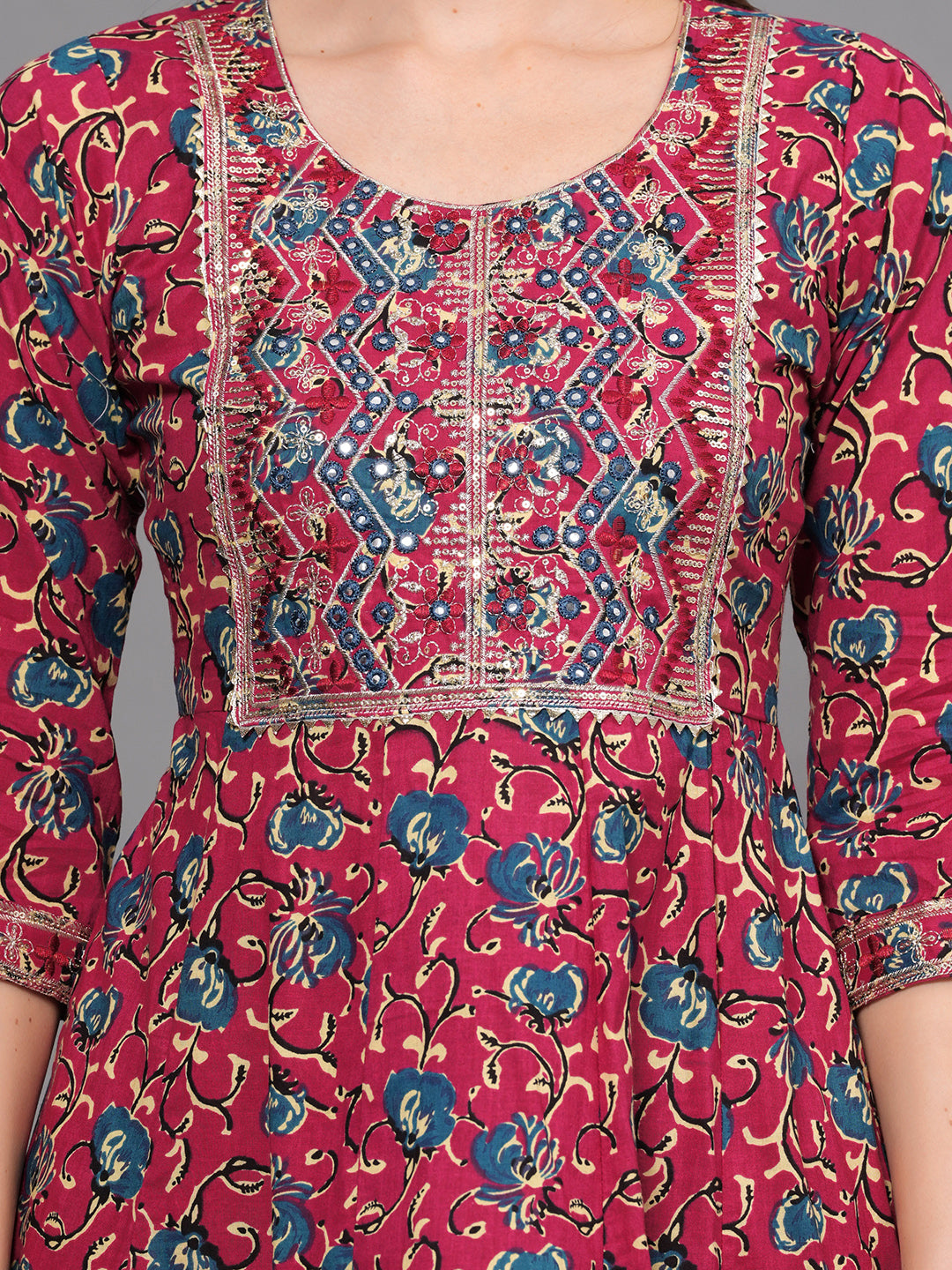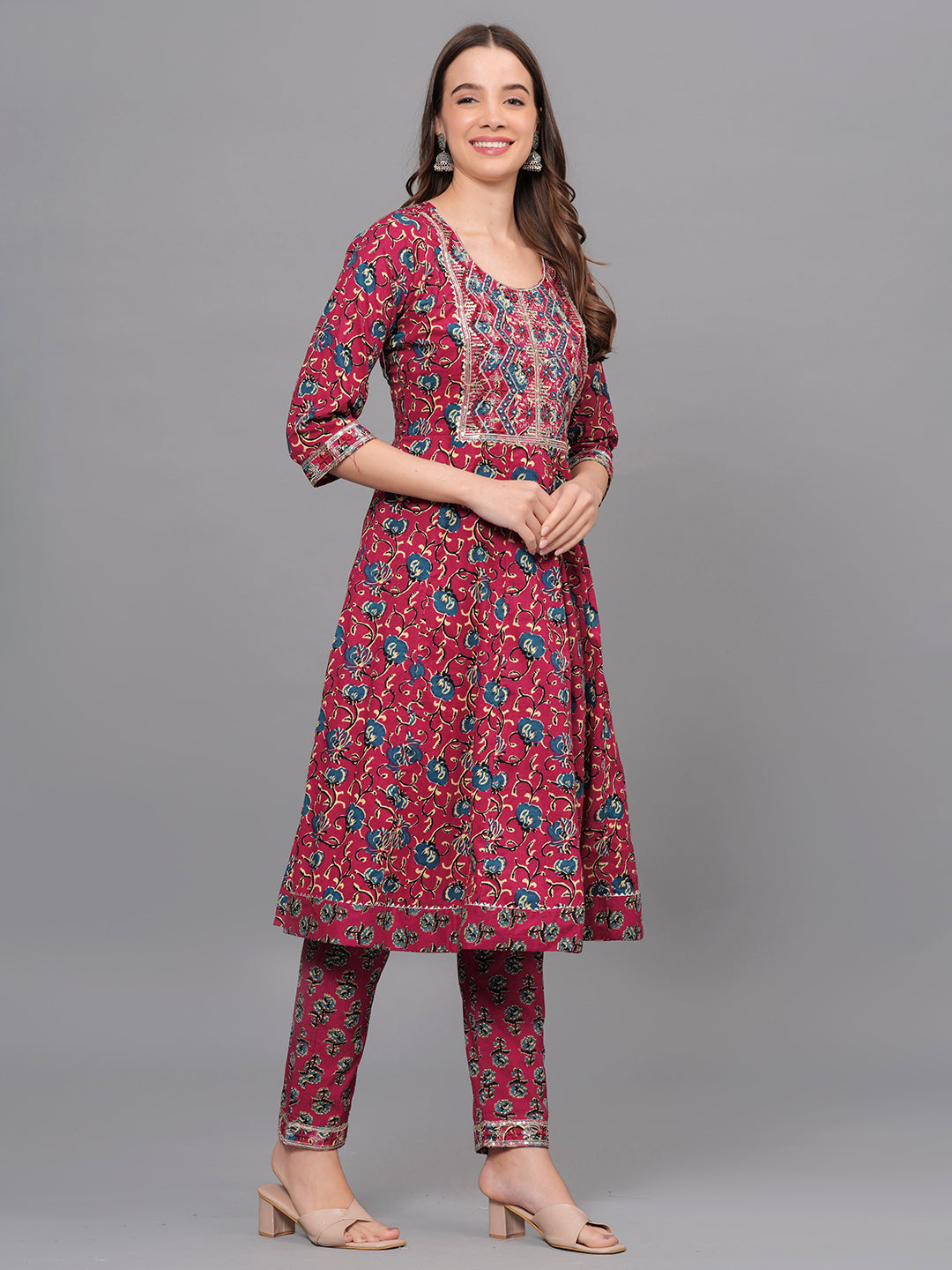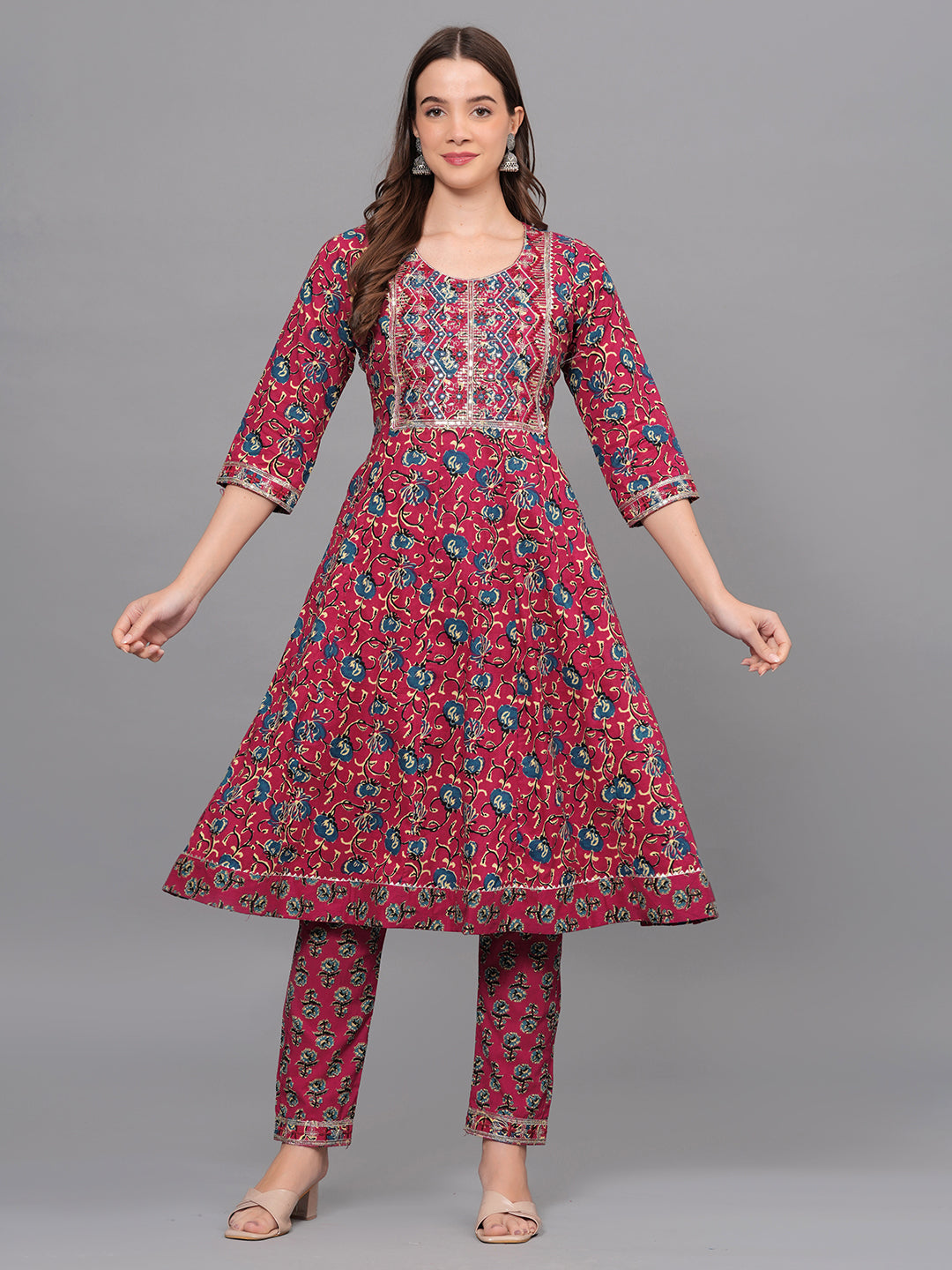 Make a statement with this vibrant maroon kurta set that exudes traditional charm and modern elegance. Crafted from soft, breathable cotton, the kurta features a beautiful all-over floral print, highlighted by intricate multicolor thread embroidery on the front yoke. The 3/4th sleeves and hemline are finished with detailed printed borders, enhancing the ethnic appeal.