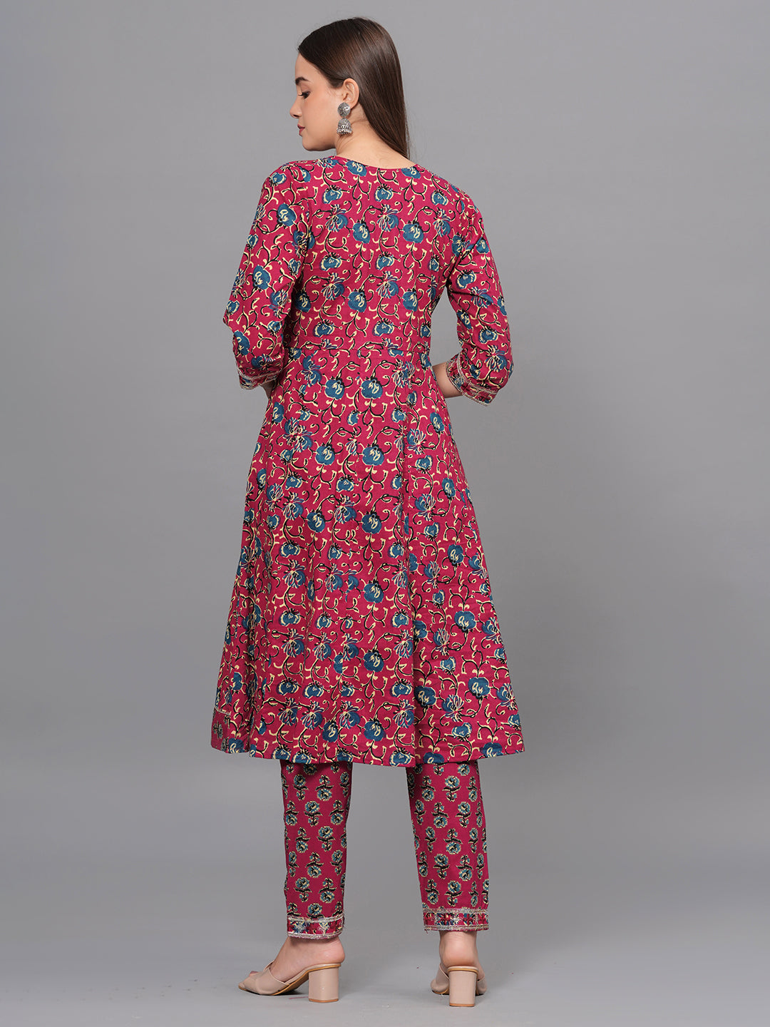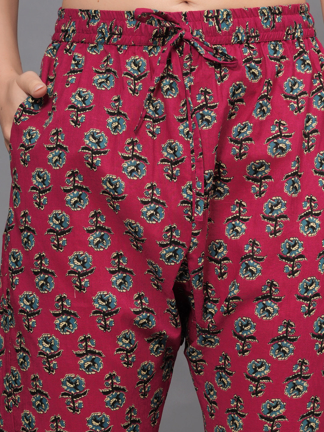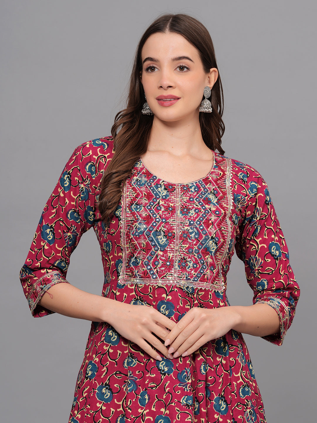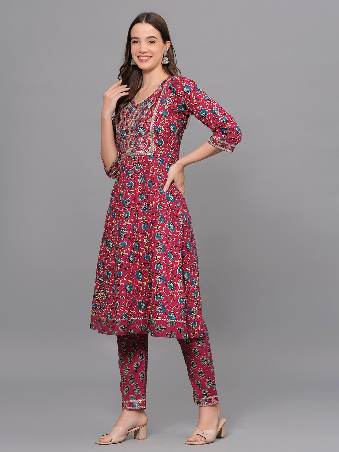 Make a statement with this vibrant maroon kurta set that exudes traditional charm and modern elegance. Crafted from soft, breathable cotton, the kurta features a beautiful all-over floral print, highlighted by intricate multicolor thread embroidery on the front yoke. The 3/4th sleeves and hemline are finished with detailed printed borders, enhancing the ethnic appeal.