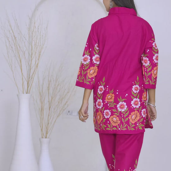 Pink Floral Printed Cotton Shirt Collar Co-Ord Set for Women