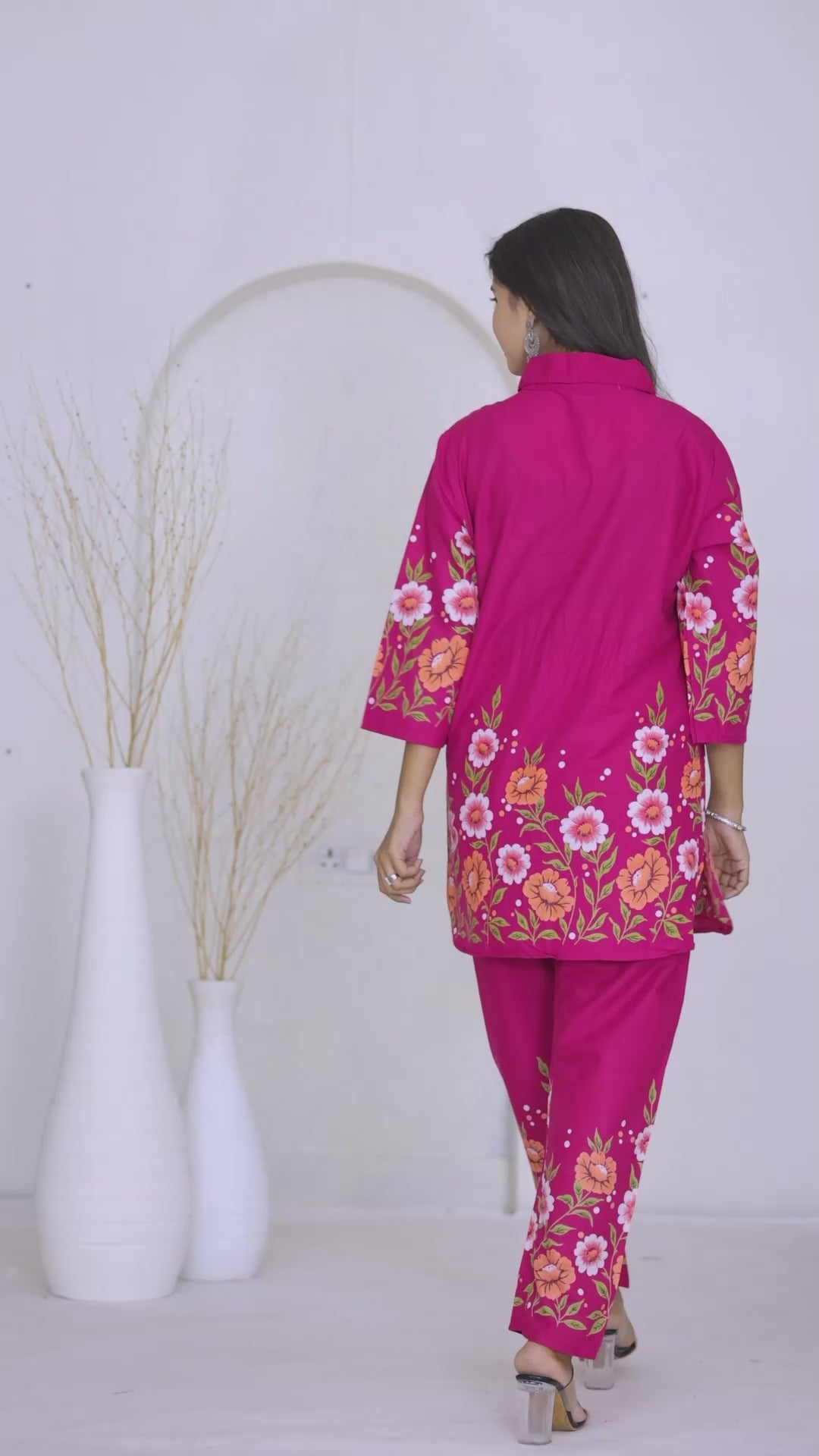 Refresh your everyday ethnic wardrobe with this elegant Pink Floral Co-Ord Set, Crafted in a rich solid base with vibrant floral prints along the hem, sleeves, and pants, this coordinated set is perfect for casual outings, office wear, or festive daytime occasions.