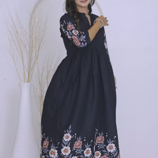 Premium Black Floral Printed Fit & Flare Dress with 3/4 Sleeves