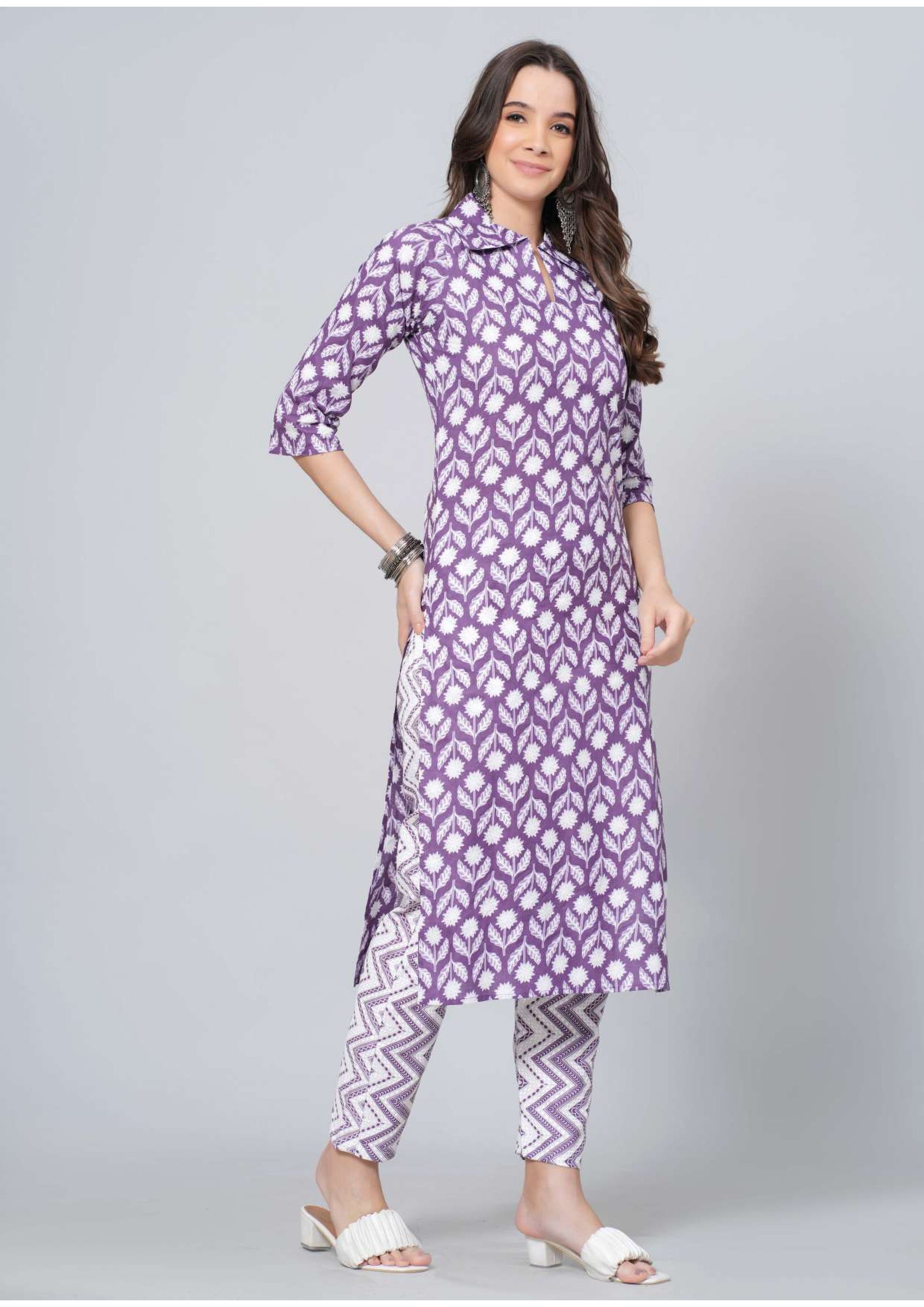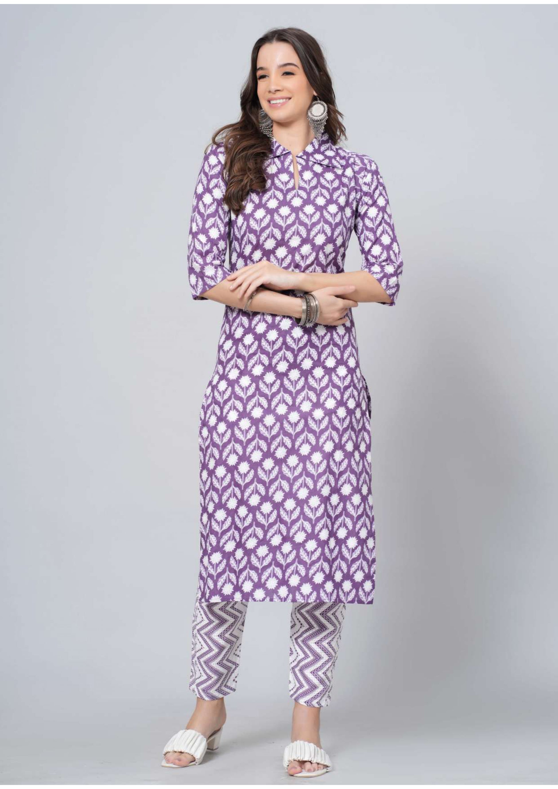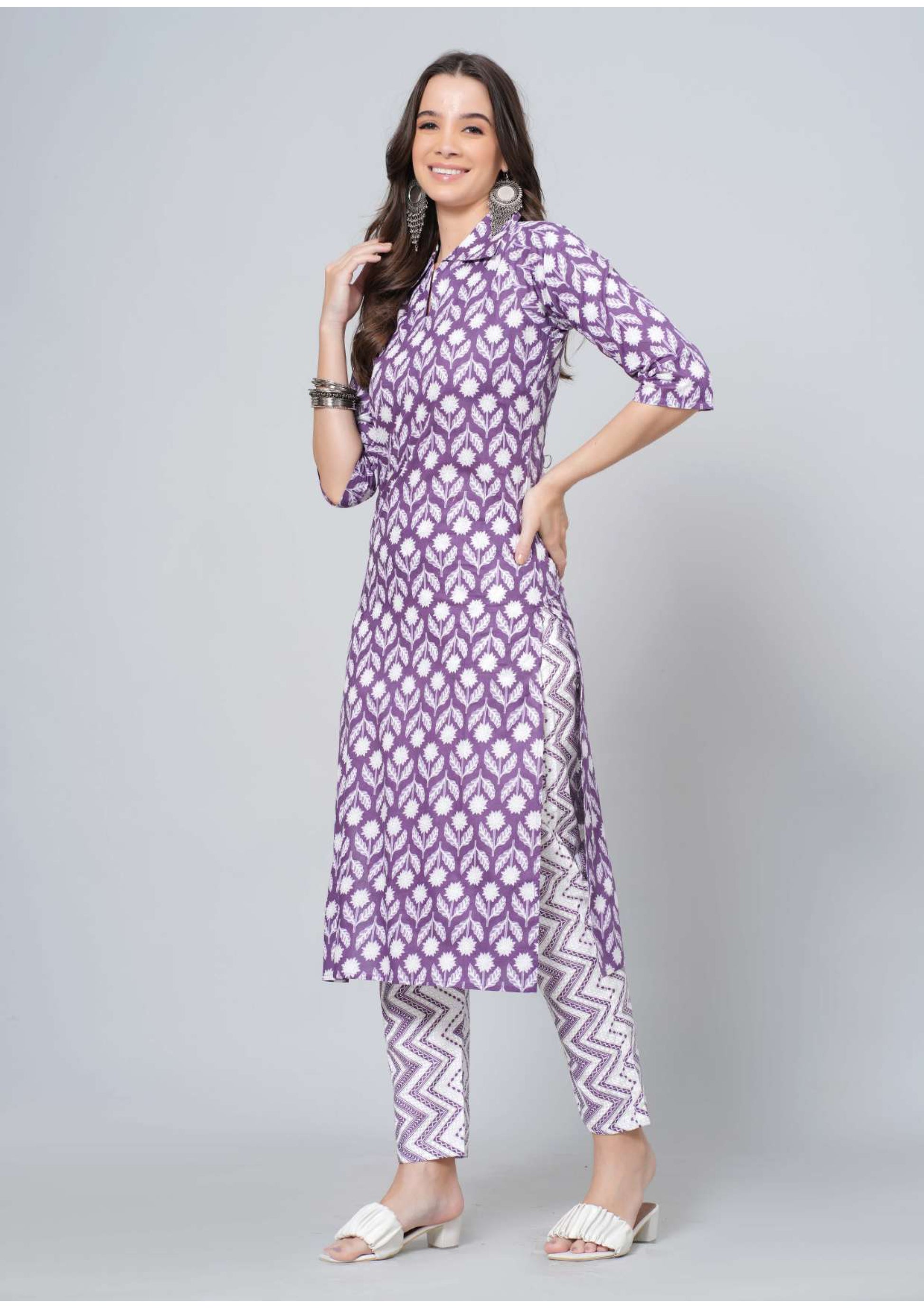 Step into effortless elegance with this stylish purple floral printed kurta paired with contrasting zigzag print pants. Made from soft, breathable cotton, this set is perfect for all-day comfort while maintaining a chic ethnic look. The kurta features a notched neckline, three-quarter sleeves, and side slits for ease of movement. The pants come with a straight fit and an elastic waistband for a flattering silhouette.